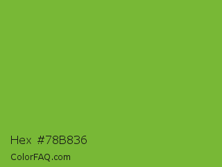 Hex #78b836 Color is a normal green color and the nearest color is Sushi #87ab39. Hex code #78b836 and RGB value is rgb(120,184,54). In RGB color space, this color is composed of 47% red, 72% green, 21% blue, In CMYK color space, this color is composed of 35% cyan, 0% magenta, 71% yellow , 28% black , In HSL color space, this color has a hue angle of 90° , 55% saturation and 47% lightness.
