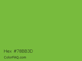 Hex #78bb3d Color is a normal green color and the nearest color is Sushi #87ab39. Hex code #78bb3d and RGB value is rgb(120,187,61). In RGB color space, this color is composed of 47% red, 73% green, 24% blue, In CMYK color space, this color is composed of 36% cyan, 0% magenta, 67% yellow , 27% black , In HSL color space, this color has a hue angle of 92° , 51% saturation and 49% lightness.