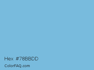 Hex #78bbdd Color is a light blue color and the nearest color is Aero #7cb9e8. Hex code #78bbdd and RGB value is rgb(120,187,221). In RGB color space, this color is composed of 47% red, 73% green, 87% blue, In CMYK color space, this color is composed of 46% cyan, 15% magenta, 0% yellow , 13% black , In HSL color space, this color has a hue angle of 200° , 60% saturation and 67% lightness.
