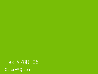 Hex #78be06 Color is a normal green color and the nearest color is Lima #76bd17. Hex code #78be06 and RGB value is rgb(120,190,6). In RGB color space, this color is composed of 47% red, 75% green, 2% blue, In CMYK color space, this color is composed of 37% cyan, 0% magenta, 97% yellow , 25% black , In HSL color space, this color has a hue angle of 83° , 94% saturation and 38% lightness.