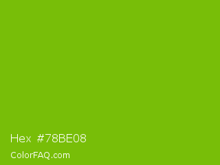 Hex #78be08 Color is a normal green color and the nearest color is Lima #76bd17. Hex code #78be08 and RGB value is rgb(120,190,8). In RGB color space, this color is composed of 47% red, 75% green, 3% blue, In CMYK color space, this color is composed of 37% cyan, 0% magenta, 96% yellow , 25% black , In HSL color space, this color has a hue angle of 83° , 92% saturation and 39% lightness.