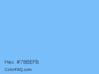 Hex #78befb Color is a light blue color and the nearest color is Very Light Azure #74bbfb. Hex code #78befb and RGB value is rgb(120,190,251). In RGB color space, this color is composed of 47% red, 75% green, 98% blue, In CMYK color space, this color is composed of 52% cyan, 24% magenta, 0% yellow , 2% black , In HSL color space, this color has a hue angle of 208° , 94% saturation and 73% lightness.