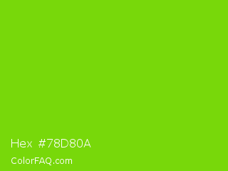Hex #78d80a Color is a normal green color and the nearest color is Alien Armpit #84de02. Hex code #78d80a and RGB value is rgb(120,216,10). In RGB color space, this color is composed of 47% red, 85% green, 4% blue, In CMYK color space, this color is composed of 44% cyan, 0% magenta, 95% yellow , 15% black , In HSL color space, this color has a hue angle of 88° , 91% saturation and 44% lightness.