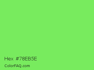 Hex #78eb5e Color is a light green color and the nearest color is Screamin Green #66ff66. Hex code #78eb5e and RGB value is rgb(120,235,94). In RGB color space, this color is composed of 47% red, 92% green, 37% blue, In CMYK color space, this color is composed of 49% cyan, 0% magenta, 60% yellow , 8% black , In HSL color space, this color has a hue angle of 109° , 78% saturation and 65% lightness.