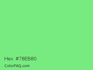 Hex #78eb80 Color is a light green color and the nearest color is Pastel Green #77dd77. Hex code #78eb80 and RGB value is rgb(120,235,128). In RGB color space, this color is composed of 47% red, 92% green, 50% blue, In CMYK color space, this color is composed of 49% cyan, 0% magenta, 46% yellow , 8% black , In HSL color space, this color has a hue angle of 124° , 74% saturation and 70% lightness.