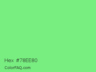 Hex #78ee80 Color is a light green color and the nearest color is Pastel Green #77dd77. Hex code #78ee80 and RGB value is rgb(120,238,128). In RGB color space, this color is composed of 47% red, 93% green, 50% blue, In CMYK color space, this color is composed of 50% cyan, 0% magenta, 46% yellow , 7% black , In HSL color space, this color has a hue angle of 124° , 78% saturation and 70% lightness.