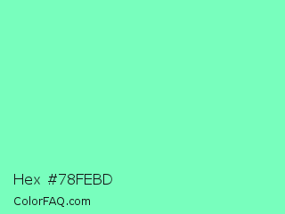 Hex #78febd Color is a light green color and the nearest color is Aquamarine #7fffd4. Hex code #78febd and RGB value is rgb(120,254,189). In RGB color space, this color is composed of 47% red, 100% green, 74% blue, In CMYK color space, this color is composed of 53% cyan, 0% magenta, 26% yellow , 0% black , In HSL color space, this color has a hue angle of 151° , 99% saturation and 73% lightness.