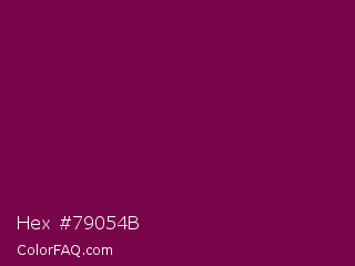 Hex #79054b Color is a dark magenta color and the nearest color is Rose Bud Cherry #800b47. Hex code #79054b and RGB value is rgb(121,5,75). In RGB color space, this color is composed of 47% red, 2% green, 29% blue, In CMYK color space, this color is composed of 0% cyan, 96% magenta, 38% yellow , 53% black , In HSL color space, this color has a hue angle of 324° , 92% saturation and 25% lightness.
