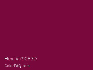 Hex #79083d Color is a dark rose color and the nearest color is Siren #7a013a. Hex code #79083d and RGB value is rgb(121,8,61). In RGB color space, this color is composed of 47% red, 3% green, 24% blue, In CMYK color space, this color is composed of 0% cyan, 93% magenta, 50% yellow , 53% black , In HSL color space, this color has a hue angle of 332° , 88% saturation and 25% lightness.