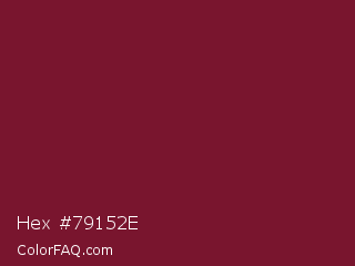 Hex #79152e Color is a dark red color and the nearest color is Claret #7f1734. Hex code #79152e and RGB value is rgb(121,21,46). In RGB color space, this color is composed of 47% red, 8% green, 18% blue, In CMYK color space, this color is composed of 0% cyan, 83% magenta, 62% yellow , 53% black , In HSL color space, this color has a hue angle of 345° , 70% saturation and 28% lightness.