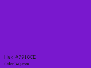 Hex #7918ce Color is a normal purple color and the nearest color is French Violet #8806ce. Hex code #7918ce and RGB value is rgb(121,24,206). In RGB color space, this color is composed of 47% red, 9% green, 81% blue, In CMYK color space, this color is composed of 41% cyan, 88% magenta, 0% yellow , 19% black , In HSL color space, this color has a hue angle of 272° , 79% saturation and 45% lightness.