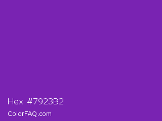 Hex #7923b2 Color is a normal purple color and the nearest color is Grape #6f2da8. Hex code #7923b2 and RGB value is rgb(121,35,178). In RGB color space, this color is composed of 47% red, 14% green, 70% blue, In CMYK color space, this color is composed of 32% cyan, 80% magenta, 0% yellow , 30% black , In HSL color space, this color has a hue angle of 276° , 67% saturation and 42% lightness.