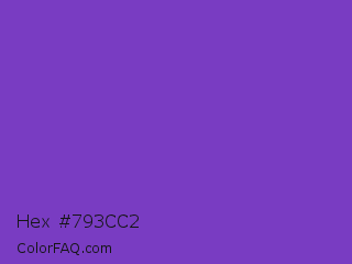 Hex #793cc2 Color is a normal violet color and the nearest color is Studio #714ab2. Hex code #793cc2 and RGB value is rgb(121,60,194). In RGB color space, this color is composed of 47% red, 24% green, 76% blue, In CMYK color space, this color is composed of 38% cyan, 69% magenta, 0% yellow , 24% black , In HSL color space, this color has a hue angle of 267° , 53% saturation and 50% lightness.