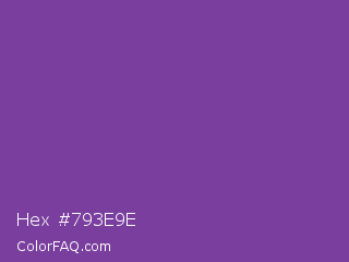 Hex #793e9e Color is a normal purple color and the nearest color is Royal Purple #6b3fa0. Hex code #793e9e and RGB value is rgb(121,62,158). In RGB color space, this color is composed of 47% red, 24% green, 62% blue, In CMYK color space, this color is composed of 23% cyan, 61% magenta, 0% yellow , 38% black , In HSL color space, this color has a hue angle of 277° , 44% saturation and 43% lightness.