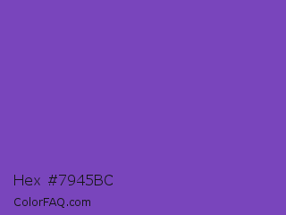 Hex #7945bc Color is a normal violet color and the nearest color is Studio #714ab2. Hex code #7945bc and RGB value is rgb(121,69,188). In RGB color space, this color is composed of 47% red, 27% green, 74% blue, In CMYK color space, this color is composed of 36% cyan, 63% magenta, 0% yellow , 26% black , In HSL color space, this color has a hue angle of 266° , 47% saturation and 50% lightness.