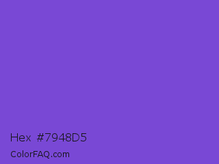 Hex #7948d5 Color is a normal violet color and the nearest color is Slate Blue #6a5acd. Hex code #7948d5 and RGB value is rgb(121,72,213). In RGB color space, this color is composed of 47% red, 28% green, 84% blue, In CMYK color space, this color is composed of 43% cyan, 66% magenta, 0% yellow , 16% black , In HSL color space, this color has a hue angle of 261° , 63% saturation and 56% lightness.