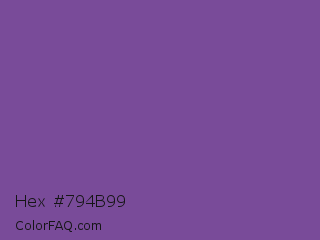 Hex #794b99 Color is a normal purple color and the nearest color is Dark Lavender #734f96. Hex code #794b99 and RGB value is rgb(121,75,153). In RGB color space, this color is composed of 47% red, 29% green, 60% blue, In CMYK color space, this color is composed of 21% cyan, 51% magenta, 0% yellow , 40% black , In HSL color space, this color has a hue angle of 275° , 34% saturation and 45% lightness.