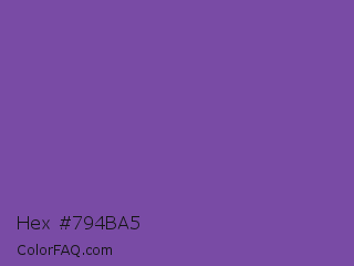 Hex #794ba5 Color is a normal purple color and the nearest color is Royal Purple #7851a9. Hex code #794ba5 and RGB value is rgb(121,75,165). In RGB color space, this color is composed of 47% red, 29% green, 65% blue, In CMYK color space, this color is composed of 27% cyan, 55% magenta, 0% yellow , 35% black , In HSL color space, this color has a hue angle of 271° , 38% saturation and 47% lightness.