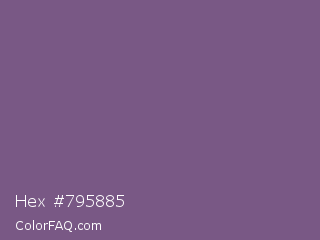 Hex #795885 Color is a normal purple color and the nearest color is Chinese Violet #856088. Hex code #795885 and RGB value is rgb(121,88,133). In RGB color space, this color is composed of 47% red, 35% green, 52% blue, In CMYK color space, this color is composed of 9% cyan, 34% magenta, 0% yellow , 48% black , In HSL color space, this color has a hue angle of 284° , 20% saturation and 43% lightness.