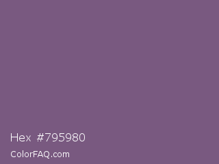 Hex #795980 Color is a normal purple color and the nearest color is Chinese Violet #856088. Hex code #795980 and RGB value is rgb(121,89,128). In RGB color space, this color is composed of 47% red, 35% green, 50% blue, In CMYK color space, this color is composed of 5% cyan, 30% magenta, 0% yellow , 50% black , In HSL color space, this color has a hue angle of 289° , 18% saturation and 43% lightness.
