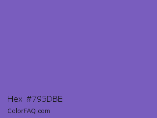 Hex #795dbe Color is a normal indigo color and the nearest color is Fuchsia Blue #7a58c1. Hex code #795dbe and RGB value is rgb(121,93,190). In RGB color space, this color is composed of 47% red, 36% green, 75% blue, In CMYK color space, this color is composed of 36% cyan, 51% magenta, 0% yellow , 25% black , In HSL color space, this color has a hue angle of 257° , 43% saturation and 55% lightness.