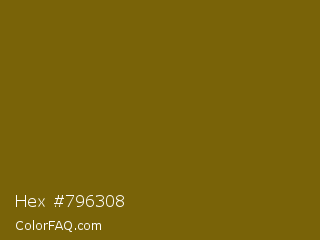 Hex #796308 Color is a dark yellow color and the nearest color is Yukon Gold #7b6608. Hex code #796308 and RGB value is rgb(121,99,8). In RGB color space, this color is composed of 47% red, 39% green, 3% blue, In CMYK color space, this color is composed of 0% cyan, 18% magenta, 93% yellow , 53% black , In HSL color space, this color has a hue angle of 48° , 88% saturation and 25% lightness.