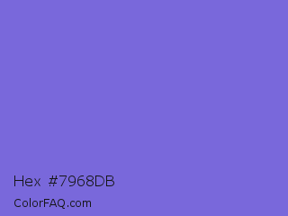 Hex #7968db Color is a light indigo color and the nearest color is Moody Blue #7f76d3. Hex code #7968db and RGB value is rgb(121,104,219). In RGB color space, this color is composed of 47% red, 41% green, 86% blue, In CMYK color space, this color is composed of 45% cyan, 53% magenta, 0% yellow , 14% black , In HSL color space, this color has a hue angle of 249° , 61% saturation and 63% lightness.