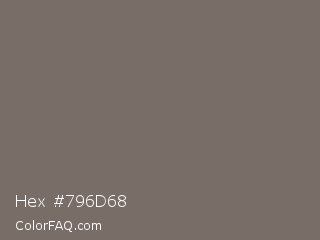 Hex #796d68 Color is a normal orange color and the nearest color is Sandstone #796d62. Hex code #796d68 and RGB value is rgb(121,109,104). In RGB color space, this color is composed of 47% red, 43% green, 41% blue, In CMYK color space, this color is composed of 0% cyan, 10% magenta, 14% yellow , 53% black , In HSL color space, this color has a hue angle of 18° , 8% saturation and 44% lightness.