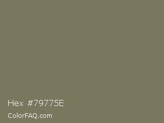 Hex #79775e Color is a normal yellow color and the nearest color is Pablo #776f61. Hex code #79775e and RGB value is rgb(121,119,94). In RGB color space, this color is composed of 47% red, 47% green, 37% blue, In CMYK color space, this color is composed of 0% cyan, 2% magenta, 22% yellow , 53% black , In HSL color space, this color has a hue angle of 56° , 13% saturation and 42% lightness.