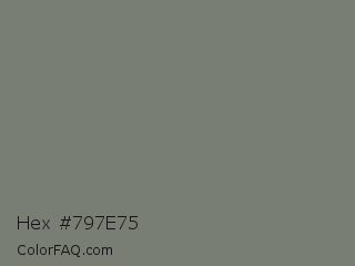 Hex #797e75 Color is a normal green color and the nearest color is Tapa #7b7874. Hex code #797e75 and RGB value is rgb(121,126,117). In RGB color space, this color is composed of 47% red, 49% green, 46% blue, In CMYK color space, this color is composed of 4% cyan, 0% magenta, 7% yellow , 51% black , In HSL color space, this color has a hue angle of 93° , 4% saturation and 48% lightness.