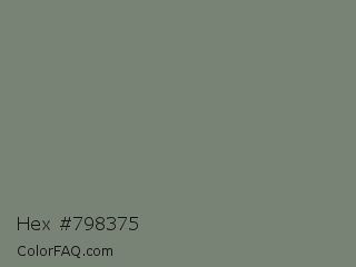 Hex #798375 Color is a normal green color and the nearest color is Smoke #738276. Hex code #798375 and RGB value is rgb(121,131,117). In RGB color space, this color is composed of 47% red, 51% green, 46% blue, In CMYK color space, this color is composed of 8% cyan, 0% magenta, 11% yellow , 49% black , In HSL color space, this color has a hue angle of 103° , 6% saturation and 49% lightness.