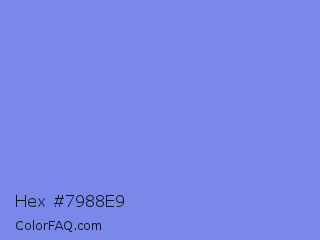 Hex #7988e9 Color is a light blue color and the nearest color is Chetwode Blue #8581d9. Hex code #7988e9 and RGB value is rgb(121,136,233). In RGB color space, this color is composed of 47% red, 53% green, 91% blue, In CMYK color space, this color is composed of 48% cyan, 42% magenta, 0% yellow , 9% black , In HSL color space, this color has a hue angle of 232° , 72% saturation and 69% lightness.