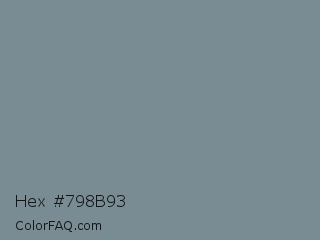 Hex #798b93 Color is a normal blue color and the nearest color is Light Slate Gray #778899. Hex code #798b93 and RGB value is rgb(121,139,147). In RGB color space, this color is composed of 47% red, 55% green, 58% blue, In CMYK color space, this color is composed of 18% cyan, 5% magenta, 0% yellow , 42% black , In HSL color space, this color has a hue angle of 198° , 11% saturation and 53% lightness.