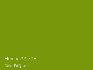 Hex #79970b Color is a normal lime color and the nearest color is Limeade #6f9d02. Hex code #79970b and RGB value is rgb(121,151,11). In RGB color space, this color is composed of 47% red, 59% green, 4% blue, In CMYK color space, this color is composed of 20% cyan, 0% magenta, 93% yellow , 41% black , In HSL color space, this color has a hue angle of 73° , 86% saturation and 32% lightness.