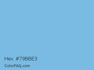Hex #79bbe3 Color is a light blue color and the nearest color is Aero #7cb9e8. Hex code #79bbe3 and RGB value is rgb(121,187,227). In RGB color space, this color is composed of 47% red, 73% green, 89% blue, In CMYK color space, this color is composed of 47% cyan, 18% magenta, 0% yellow , 11% black , In HSL color space, this color has a hue angle of 203° , 65% saturation and 68% lightness.