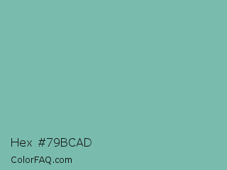 Hex #79bcad Color is a light cyan color and the nearest color is Gulf Stream #80b3ae. Hex code #79bcad and RGB value is rgb(121,188,173). In RGB color space, this color is composed of 47% red, 74% green, 68% blue, In CMYK color space, this color is composed of 36% cyan, 0% magenta, 8% yellow , 26% black , In HSL color space, this color has a hue angle of 167° , 33% saturation and 61% lightness.