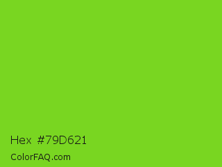 Hex #79d621 Color is a normal green color and the nearest color is Lima #76bd17. Hex code #79d621 and RGB value is rgb(121,214,33). In RGB color space, this color is composed of 47% red, 84% green, 13% blue, In CMYK color space, this color is composed of 43% cyan, 0% magenta, 85% yellow , 16% black , In HSL color space, this color has a hue angle of 91° , 73% saturation and 48% lightness.