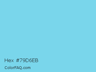 Hex #79d6eb Color is a light cyan color and the nearest color is Sky Blue #76d7ea. Hex code #79d6eb and RGB value is rgb(121,214,235). In RGB color space, this color is composed of 47% red, 84% green, 92% blue, In CMYK color space, this color is composed of 49% cyan, 9% magenta, 0% yellow , 8% black , In HSL color space, this color has a hue angle of 191° , 74% saturation and 70% lightness.