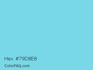 Hex #79d8e8 Color is a light cyan color and the nearest color is Sky Blue #76d7ea. Hex code #79d8e8 and RGB value is rgb(121,216,232). In RGB color space, this color is composed of 47% red, 85% green, 91% blue, In CMYK color space, this color is composed of 48% cyan, 7% magenta, 0% yellow , 9% black , In HSL color space, this color has a hue angle of 189° , 71% saturation and 69% lightness.