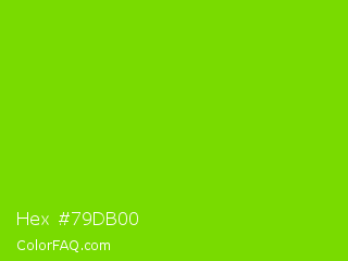 Hex #79db00 Color is a normal green color and the nearest color is Alien Armpit #84de02. Hex code #79db00 and RGB value is rgb(121,219,0). In RGB color space, this color is composed of 47% red, 86% green, 0% blue, In CMYK color space, this color is composed of 45% cyan, 0% magenta, 100% yellow , 14% black , In HSL color space, this color has a hue angle of 87° , 100% saturation and 43% lightness.