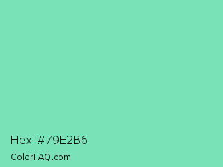 Hex #79e2b6 Color is a light green color and the nearest color is Bermuda #7dd8c6. Hex code #79e2b6 and RGB value is rgb(121,226,182). In RGB color space, this color is composed of 47% red, 89% green, 71% blue, In CMYK color space, this color is composed of 46% cyan, 0% magenta, 19% yellow , 11% black , In HSL color space, this color has a hue angle of 155° , 64% saturation and 68% lightness.