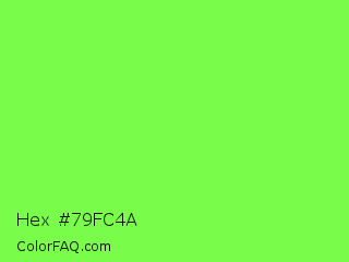 Hex #79fc4a Color is a light green color and the nearest color is Kiwi #8ee53f. Hex code #79fc4a and RGB value is rgb(121,252,74). In RGB color space, this color is composed of 47% red, 99% green, 29% blue, In CMYK color space, this color is composed of 52% cyan, 0% magenta, 71% yellow , 1% black , In HSL color space, this color has a hue angle of 104° , 97% saturation and 64% lightness.