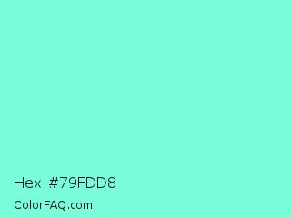 Hex #79fdd8 Color is a light green color and the nearest color is Aquamarine #7fffd4. Hex code #79fdd8 and RGB value is rgb(121,253,216). In RGB color space, this color is composed of 47% red, 99% green, 85% blue, In CMYK color space, this color is composed of 52% cyan, 0% magenta, 15% yellow , 1% black , In HSL color space, this color has a hue angle of 163° , 97% saturation and 73% lightness.