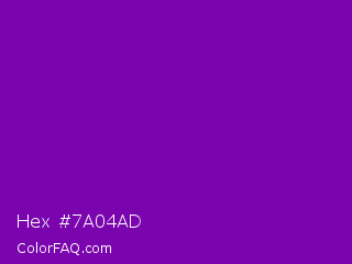 Hex #7a04ad Color is a normal purple color and the nearest color is Violet RYB #8601af. Hex code #7a04ad and RGB value is rgb(122,4,173). In RGB color space, this color is composed of 48% red, 2% green, 68% blue, In CMYK color space, this color is composed of 29% cyan, 98% magenta, 0% yellow , 32% black , In HSL color space, this color has a hue angle of 282° , 95% saturation and 35% lightness.