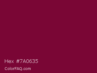 Hex #7a0635 Color is a dark rose color and the nearest color is Siren #7a013a. Hex code #7a0635 and RGB value is rgb(122,6,53). In RGB color space, this color is composed of 48% red, 2% green, 21% blue, In CMYK color space, this color is composed of 0% cyan, 95% magenta, 57% yellow , 52% black , In HSL color space, this color has a hue angle of 336° , 91% saturation and 25% lightness.