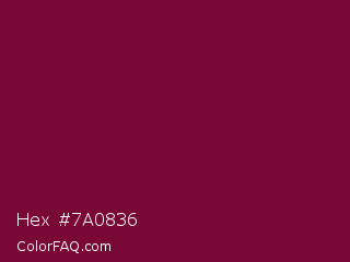 Hex #7a0836 Color is a dark rose color and the nearest color is Siren #7a013a. Hex code #7a0836 and RGB value is rgb(122,8,54). In RGB color space, this color is composed of 48% red, 3% green, 21% blue, In CMYK color space, this color is composed of 0% cyan, 93% magenta, 56% yellow , 52% black , In HSL color space, this color has a hue angle of 336° , 88% saturation and 25% lightness.