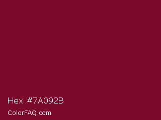 Hex #7a092b Color is a dark rose color and the nearest color is Burgundy #800020. Hex code #7a092b and RGB value is rgb(122,9,43). In RGB color space, this color is composed of 48% red, 4% green, 17% blue, In CMYK color space, this color is composed of 0% cyan, 93% magenta, 65% yellow , 52% black , In HSL color space, this color has a hue angle of 342° , 86% saturation and 26% lightness.