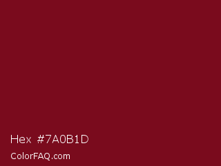 Hex #7a0b1d Color is a dark red color and the nearest color is UP Maroon #7b1113. Hex code #7a0b1d and RGB value is rgb(122,11,29). In RGB color space, this color is composed of 48% red, 4% green, 11% blue, In CMYK color space, this color is composed of 0% cyan, 91% magenta, 76% yellow , 52% black , In HSL color space, this color has a hue angle of 350° , 83% saturation and 26% lightness.