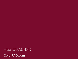 Hex #7a0b2d Color is a dark rose color and the nearest color is Claret #7f1734. Hex code #7a0b2d and RGB value is rgb(122,11,45). In RGB color space, this color is composed of 48% red, 4% green, 18% blue, In CMYK color space, this color is composed of 0% cyan, 91% magenta, 63% yellow , 52% black , In HSL color space, this color has a hue angle of 342° , 83% saturation and 26% lightness.