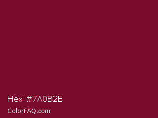 Hex #7a0b2e Color is a dark rose color and the nearest color is Claret #7f1734. Hex code #7a0b2e and RGB value is rgb(122,11,46). In RGB color space, this color is composed of 48% red, 4% green, 18% blue, In CMYK color space, this color is composed of 0% cyan, 91% magenta, 62% yellow , 52% black , In HSL color space, this color has a hue angle of 341° , 83% saturation and 26% lightness.